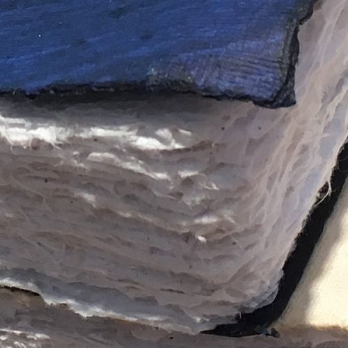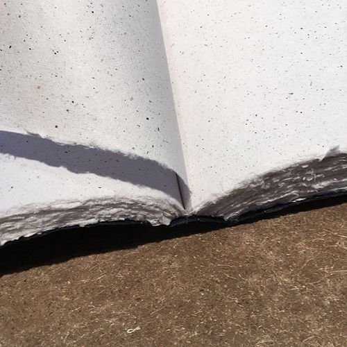 Die weißen Seiten mit Fransen und zarten Flecken bestehen aus einer Mischung aus natürlicher Baumwolle und Traubenfasern.