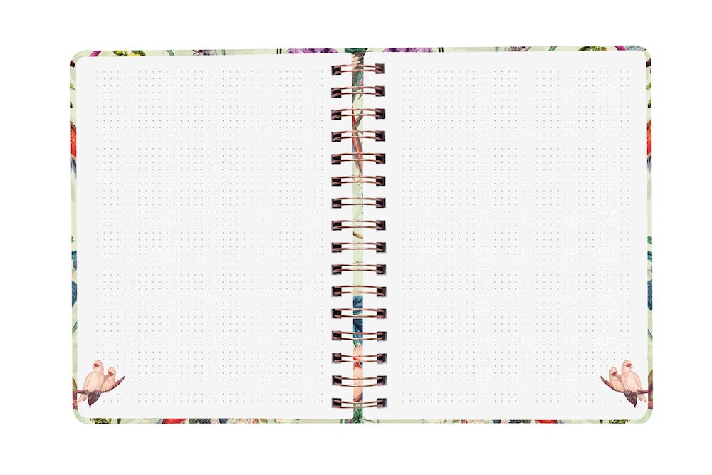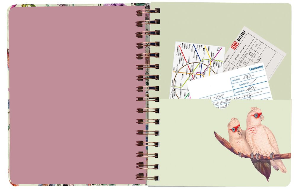 Gönn Dir ein besonderes Buch für besondere Gedanken. Feines Papier welches sich gleichermaßen für Füller, Kuli oder Bleistift eignet. Hardcover Ringbuch mit matt laminiertem Umschlag, gewebtem Lurex-Gummiband zum Verschliessen und farbiger Innentasche. Jede Seite beidseitig bedruckt: punktkariert und mit Dekor.