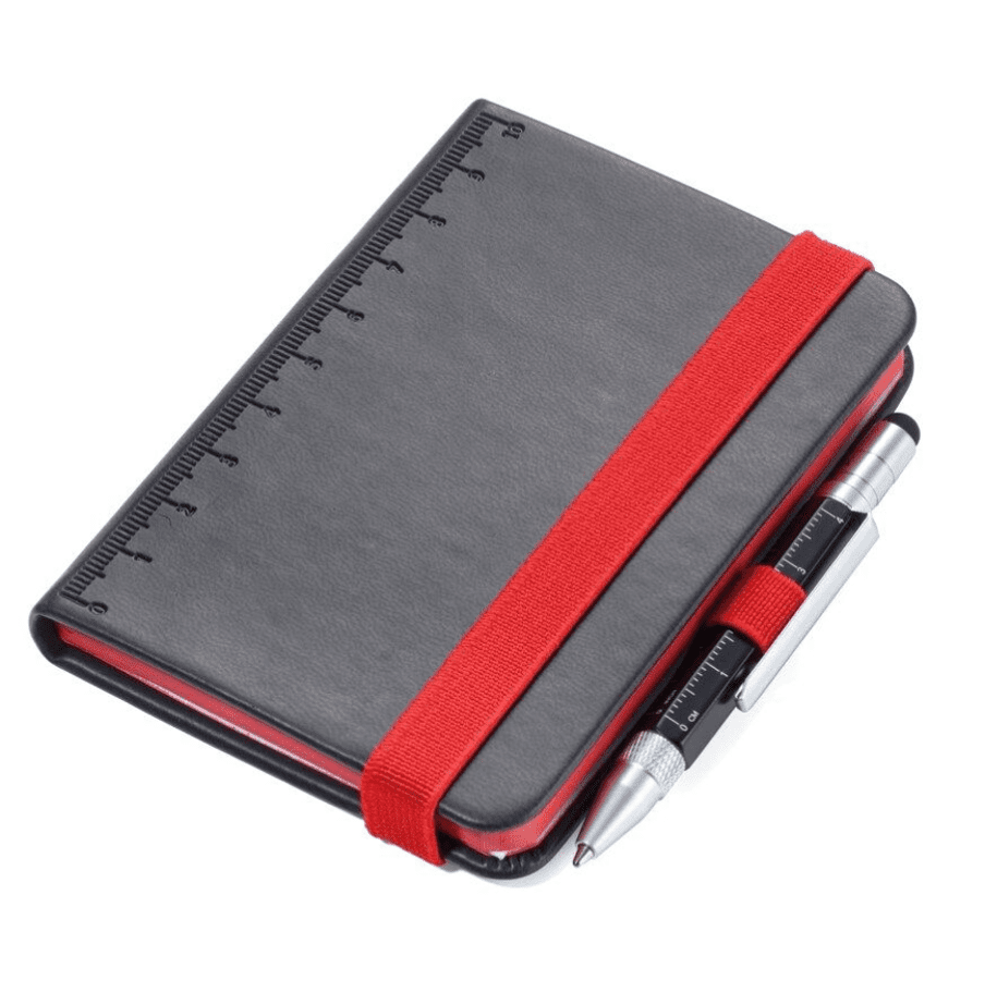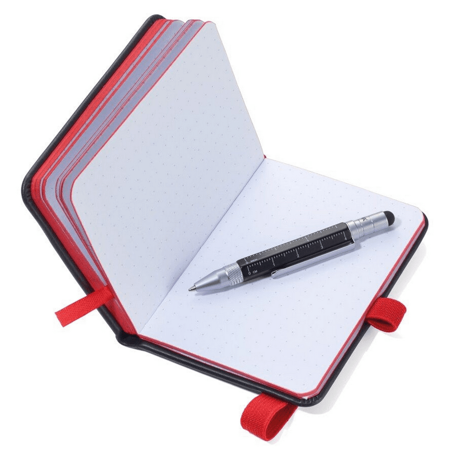 Notizblock DIN A7 inkl. Kugelschreiber, Elastikband-Verschluss, Stiftschlaufe, Lesezeichen, geprägtes Lineal (10 cm) auf Cover, FSC zertifiziertes Papier, 64 perforierte Blätter (128 Seiten), Punktraster, Fach für Belege, Multitasking-Kugelschreiber CONSTRUCTION LILIPUT (klein), schwarze Mine , Kunstleder / Metall, matt, Schwarz