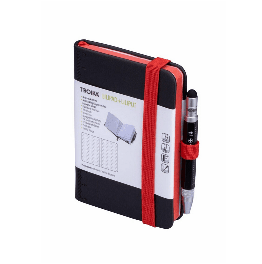 Der kleinster Multitasking-Kugelschreiber LILIPUT von TROIKA hat jetzt einen starken Partner: LILIPAD, das große kleine Notizbuch im Format DIN A7. Mit geprägtem 10-cm-Lineal und Elastikband-Verschluss, Block mit perforierten Seiten und praktischem Punktraster. Zusätzliches Fach für Belege oder Karten. LILIPAD + LILIPUT – so klein und doch so ein bärenstarkes Team.