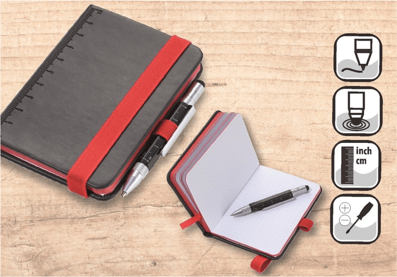 - praktischer Notizblock inklusive Multitasking-Kugelschreiber im kleinen Format – Stiftschlaufe zum Befestigen des Stiftes – der Block kommt mit Lesezeichen – einfaches Verschließen mit Elastikband möglich – immer griffbereit – halten Sie alle Gedanken fest – dank der Größe kann der Notizblock überall mitgeführt werden