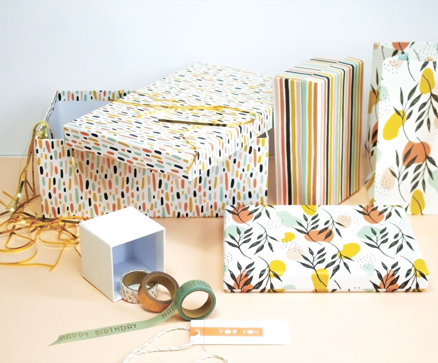 Geschenkverpackung aus stabilem Karton, zum Schenken und Aufbewahren, Grösse L Aussenmaß 28,6 x 17,9 x 11 cm, Farbe: multicolor, aus der Serie „Happy Together“.