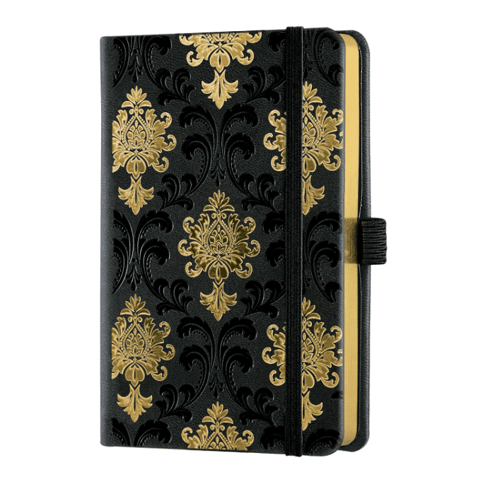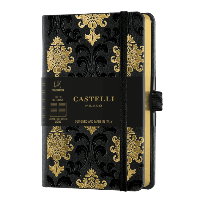 Barock-Gold-Notizbuch. Starre Abdeckung Design Barock Gold – 192 Seiten Dieses Notizbuch ist von einigen dekorativen Elementen des architektonischen italienischen Designs aus dem frühen 900 inspiriert, die durch Golddetails gekennzeichnet sind. Die Ränder sind mit einer glänzenden Goldlaminierung verziert, die Ihr Notizbuch glänzend und hell macht.Die starre Abdeckung mit runden Ecken zeichnet sich durch eine Heißprägung und eine glänzende Goldbeschichtung aus. Auf der Innenseite des Rückdeckels befindet sich eine erweiterbare Tasche, in der lose Blätter, Reisetickets und viele andere wertvolle Erinnerungen aufbewahrt werden können.